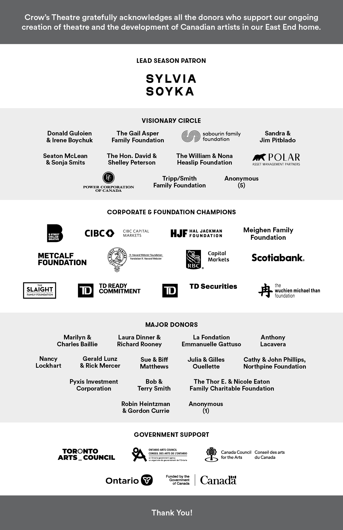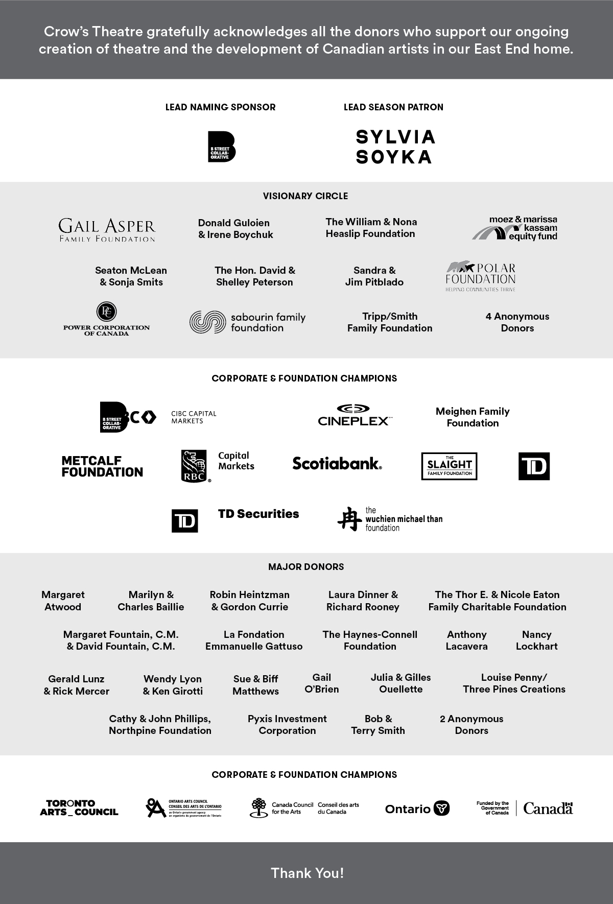 Crow’s Theatre is deeply grateful to the individuals, foundations, corporations, and partners who make our work possible.
